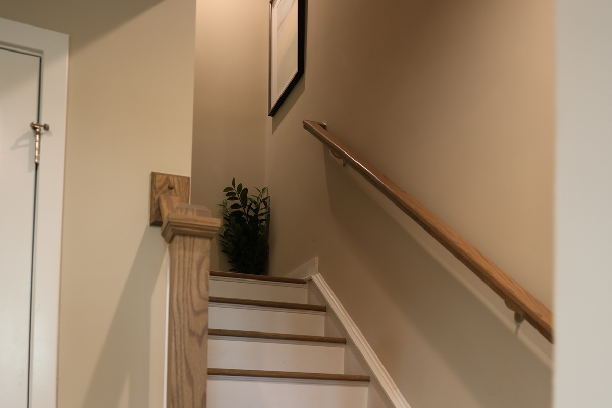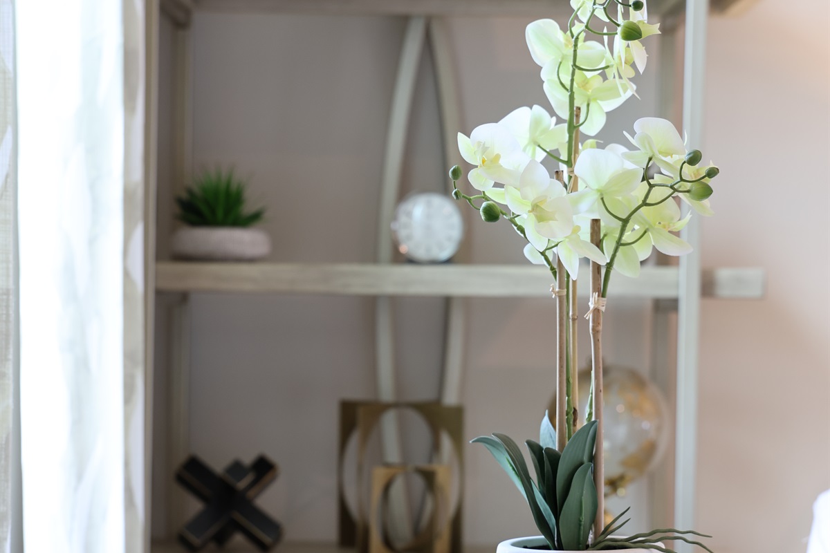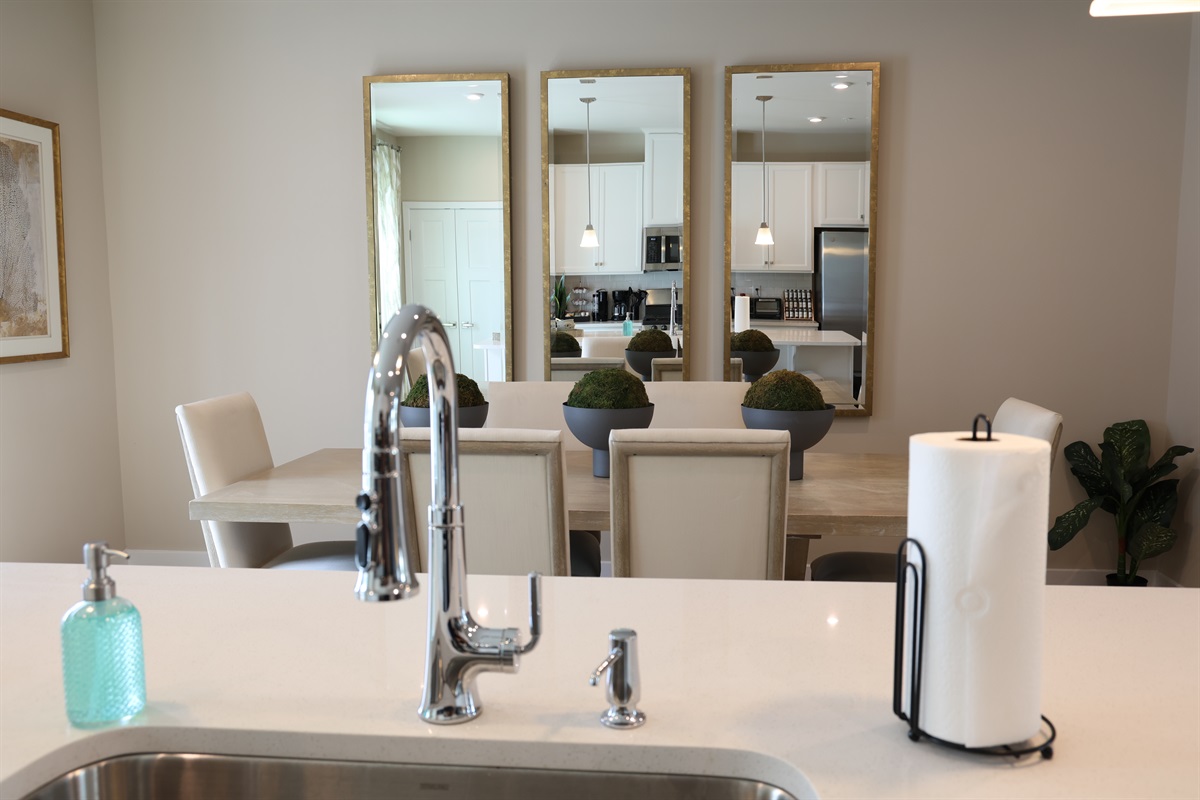 Upstairs, the open-concept kitchen is fully stocked with everything you need for cooking and baking as well as complementary items such as K-cups, creamers, tea, sugar, spices, cooking oil, dish soap, and more. Off the dining area, step out onto a private balcony and enjoy coffee or cocktails with peaceful pond views.